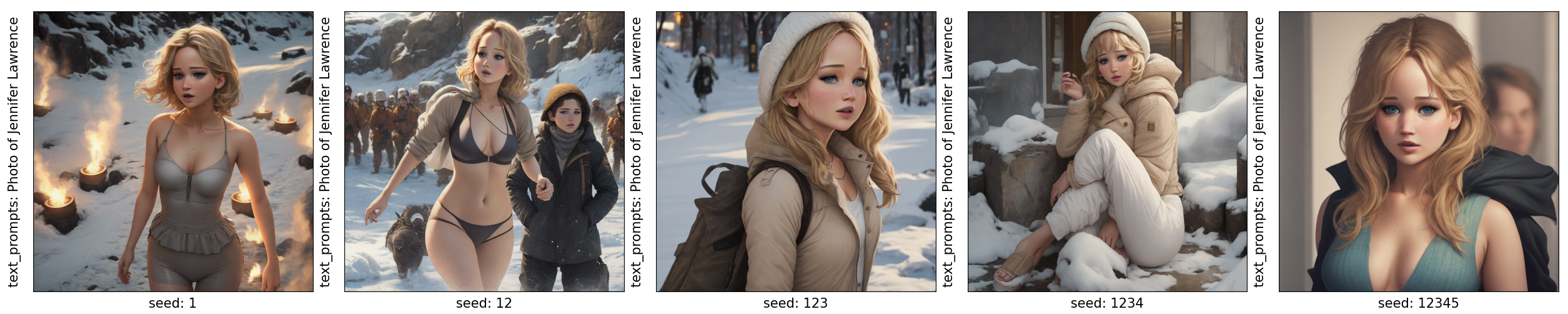 Unsurprisingly it did really well with generating images of Jennifer Lawrence. It even did a fairly good job with the body. The older models had huge issues with cropping which is showing up here.